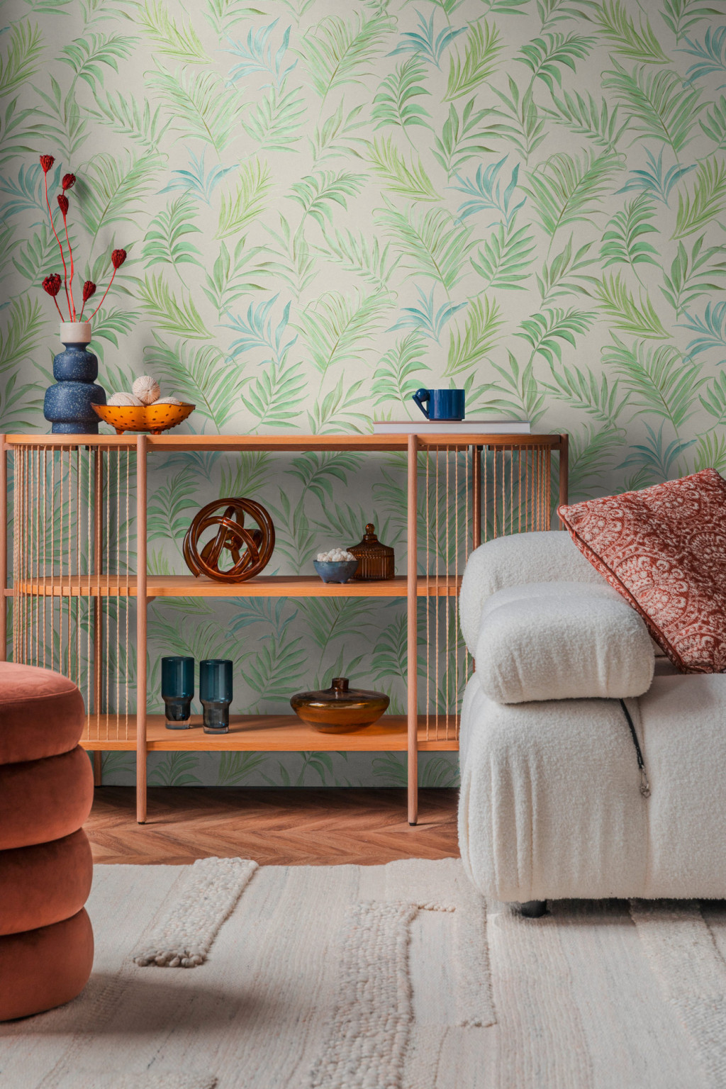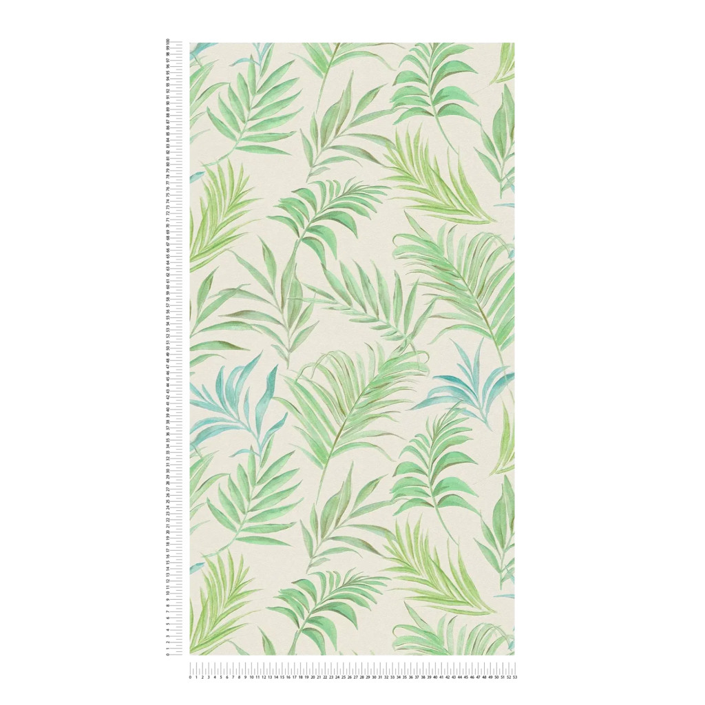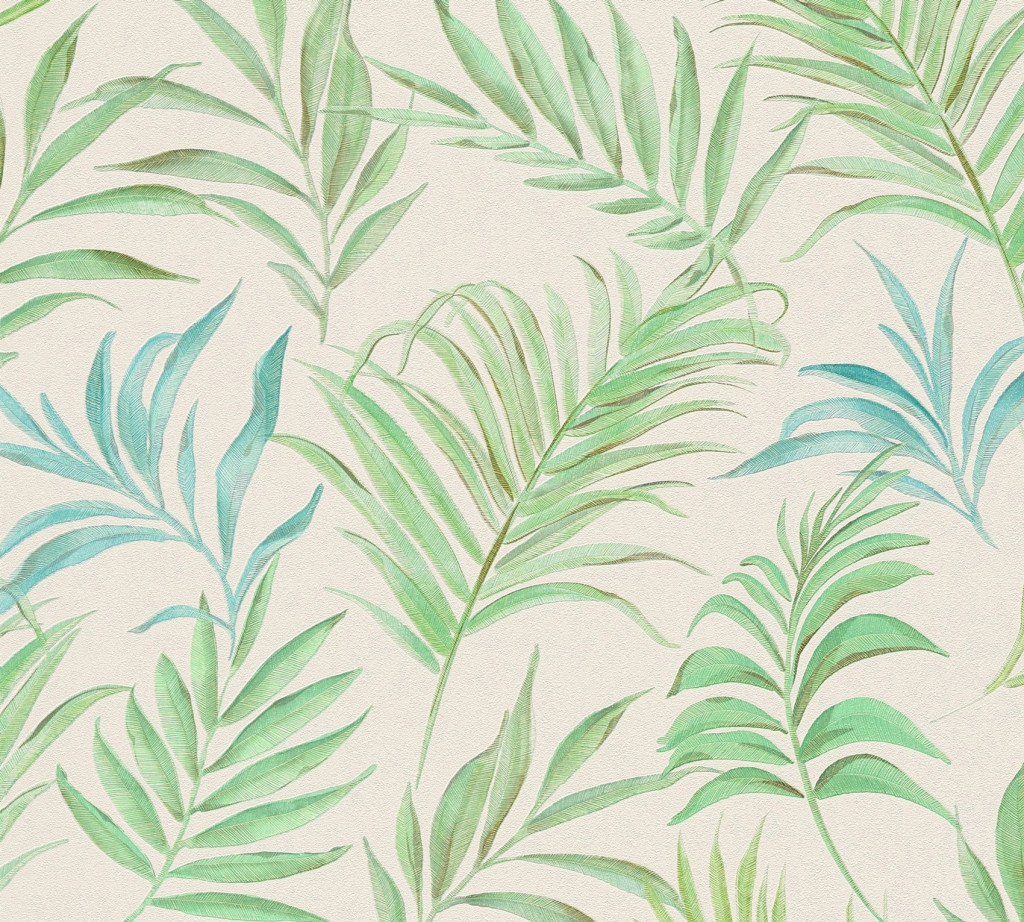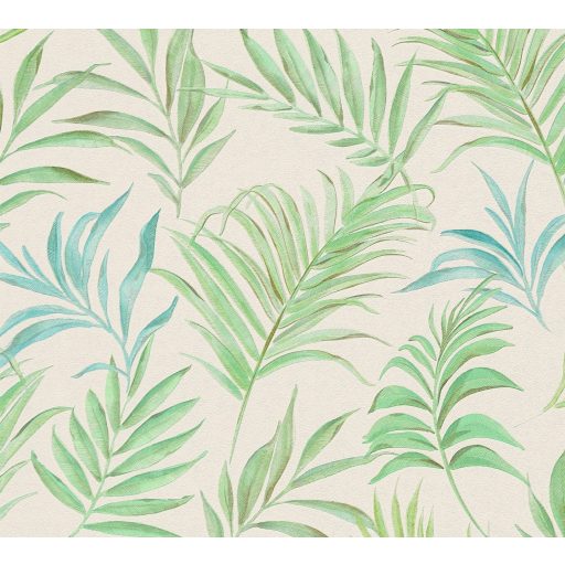 Tipp : A krémfehér alapon zöld árnyalatú pálmalevél mintás tapéta olyan friss