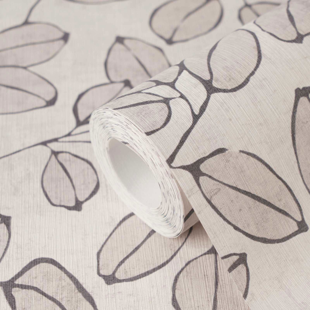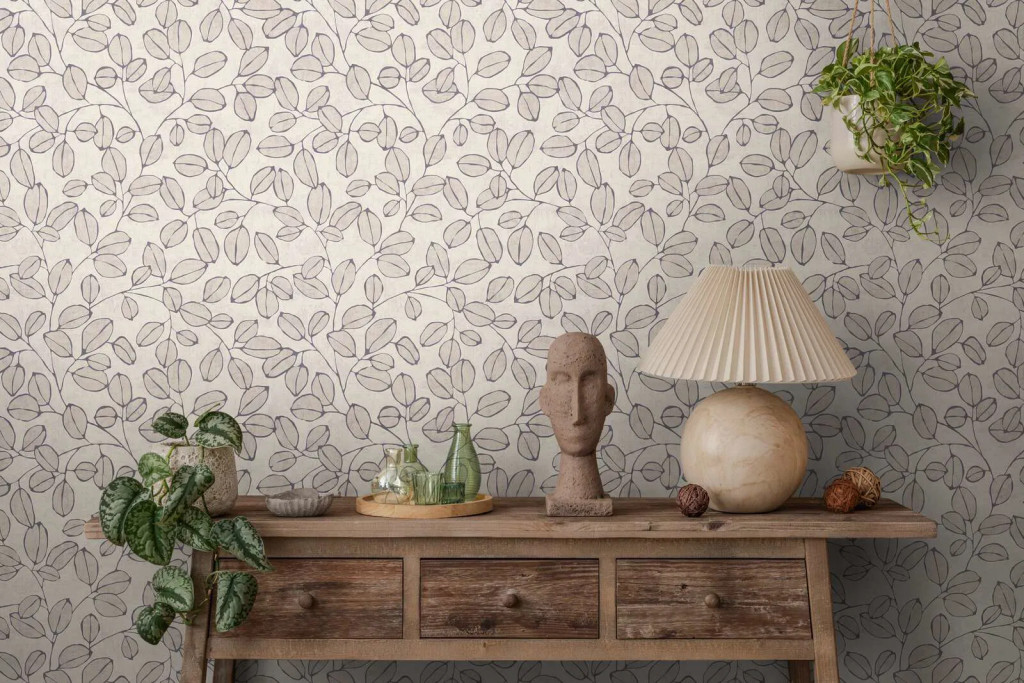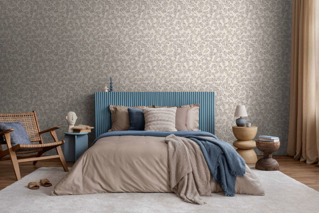 lágyan öleli körbe a teret. A rajta futó grafikus levelek elsőre füstös taupe