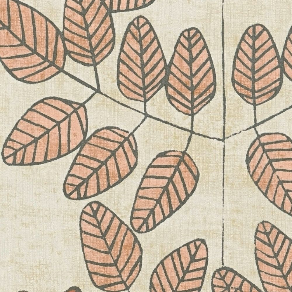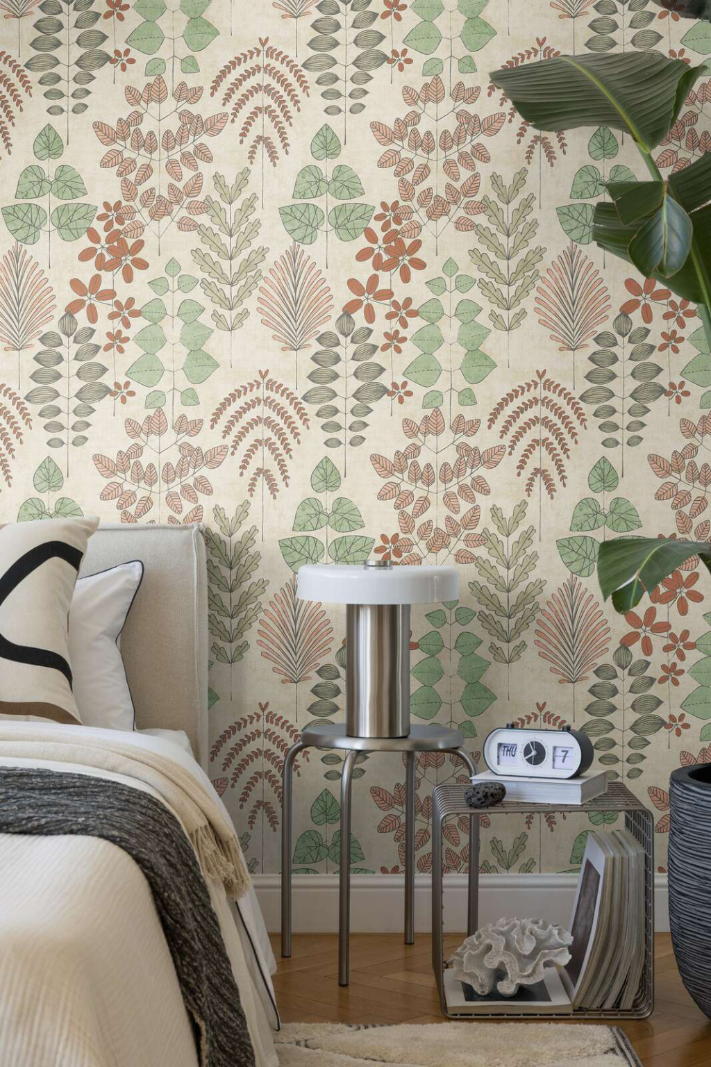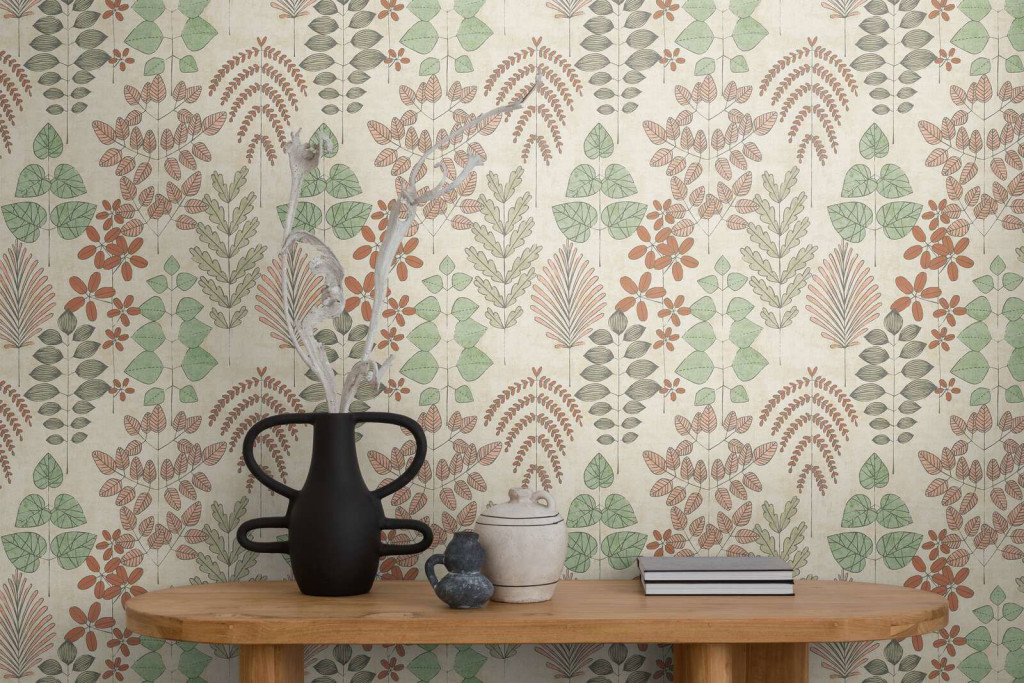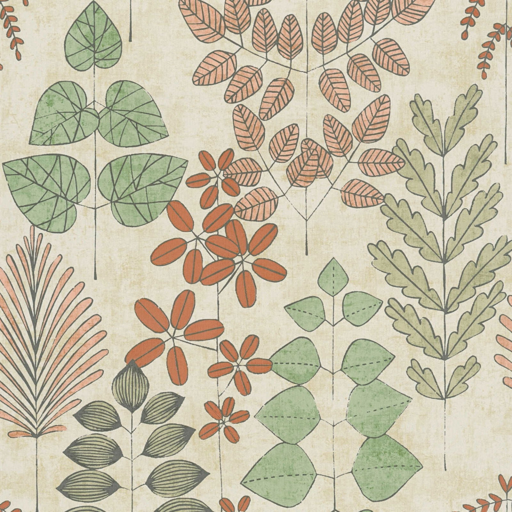 Stilizált botanikai minta páfrányokkal bogyós ágakkal és szívalakú levelekkel krémfehér terrakotta olívzöld és grafitszürke tónus tapéta