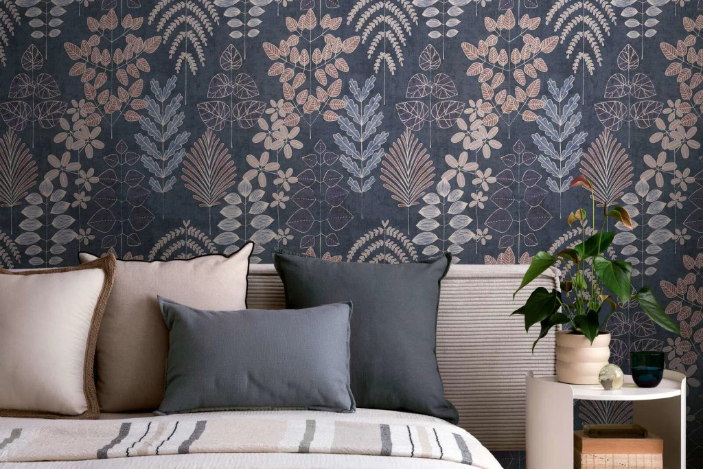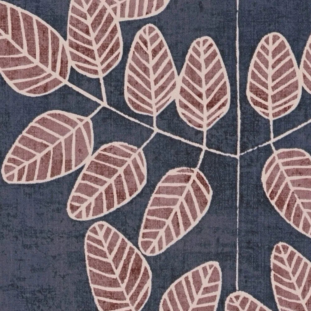 Stilizált botanikai minta páfrányokkal bogyós ágakkal és szívalakú levelekkel éjkék púderrózsaszín rozsda szürkésbarna és lila tónus tapéta