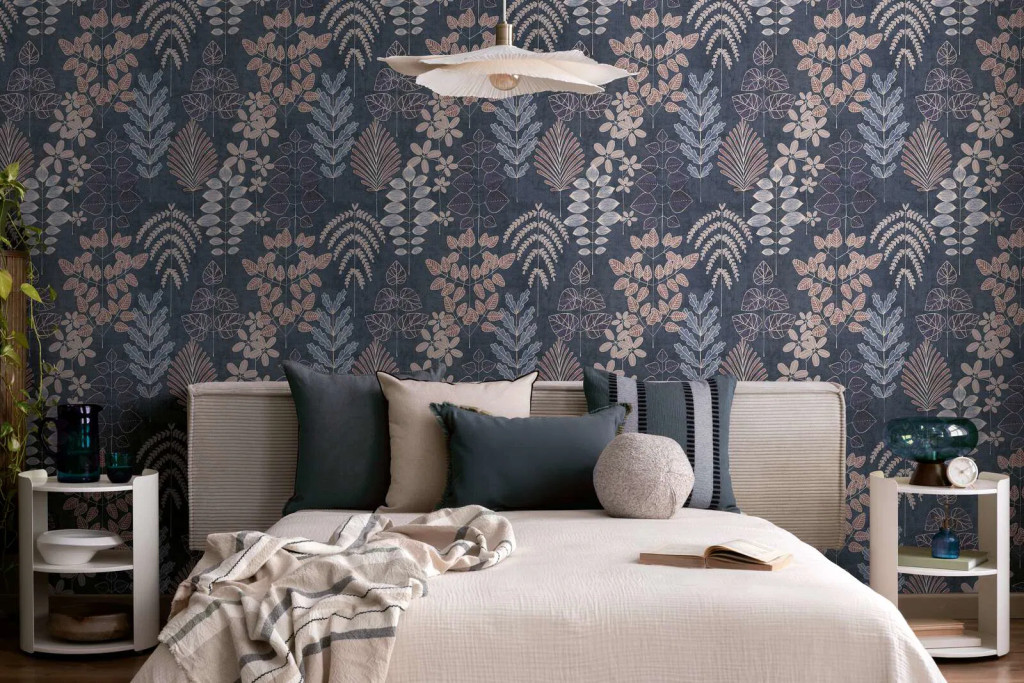 a mély alapszínből. Ez a tapéta elegáns meghitt atmoszférát teremt