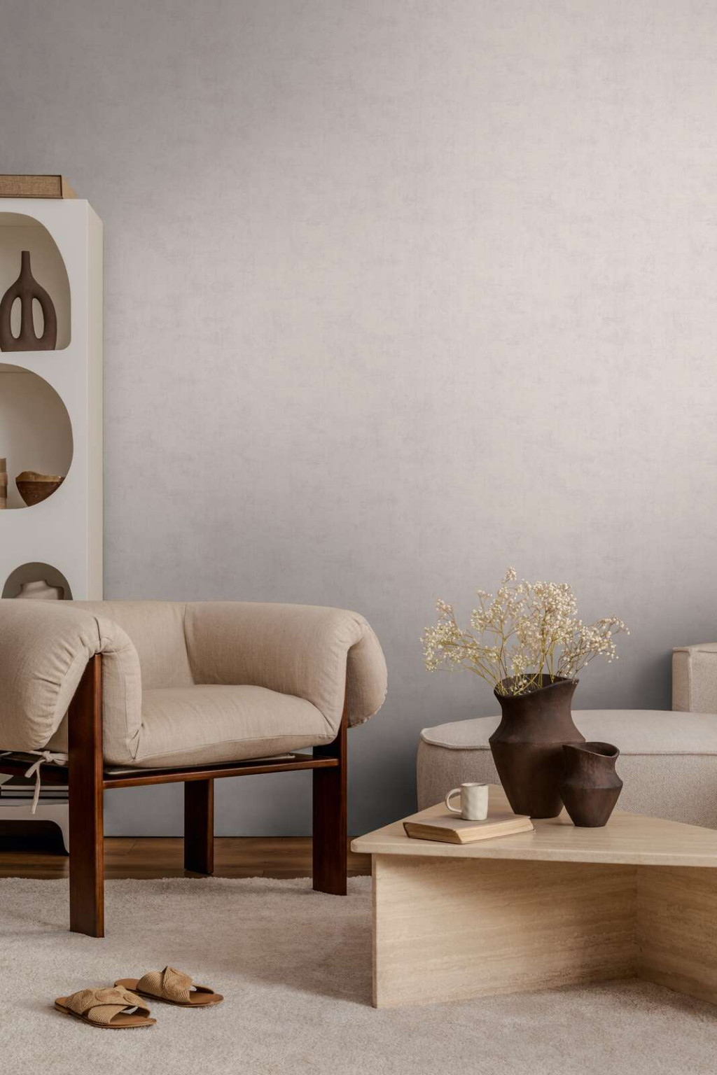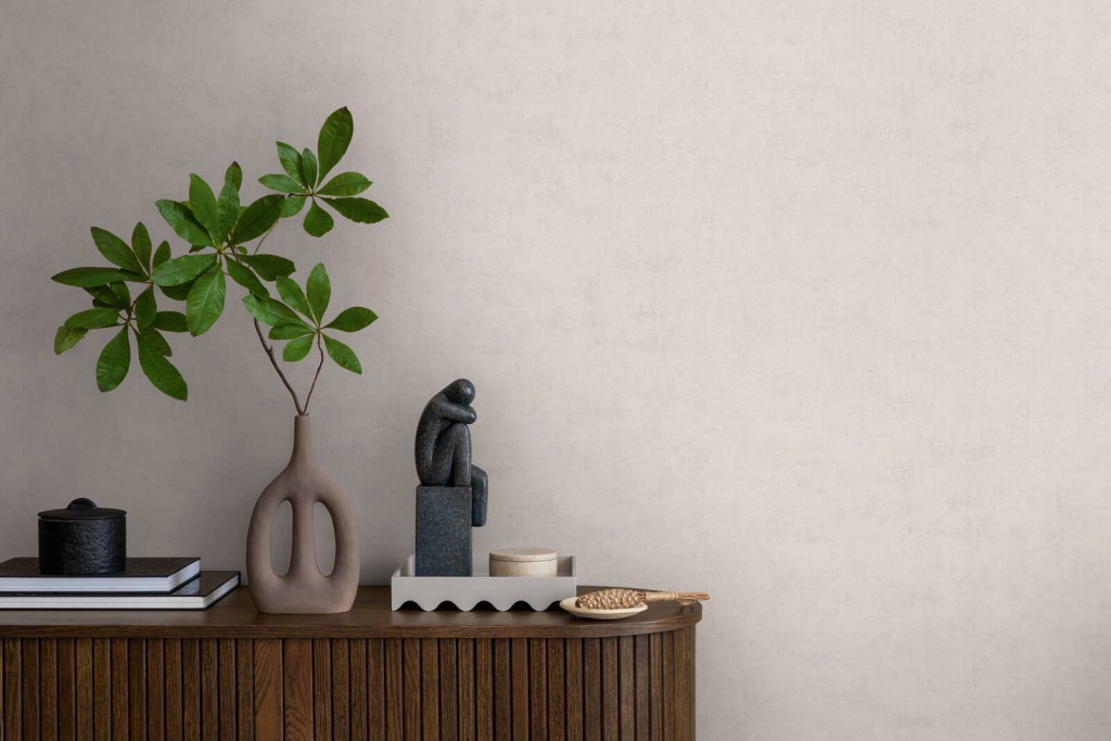 a halvány mályvás-szürke tónusok finom játéka mélységet ad a falnak.