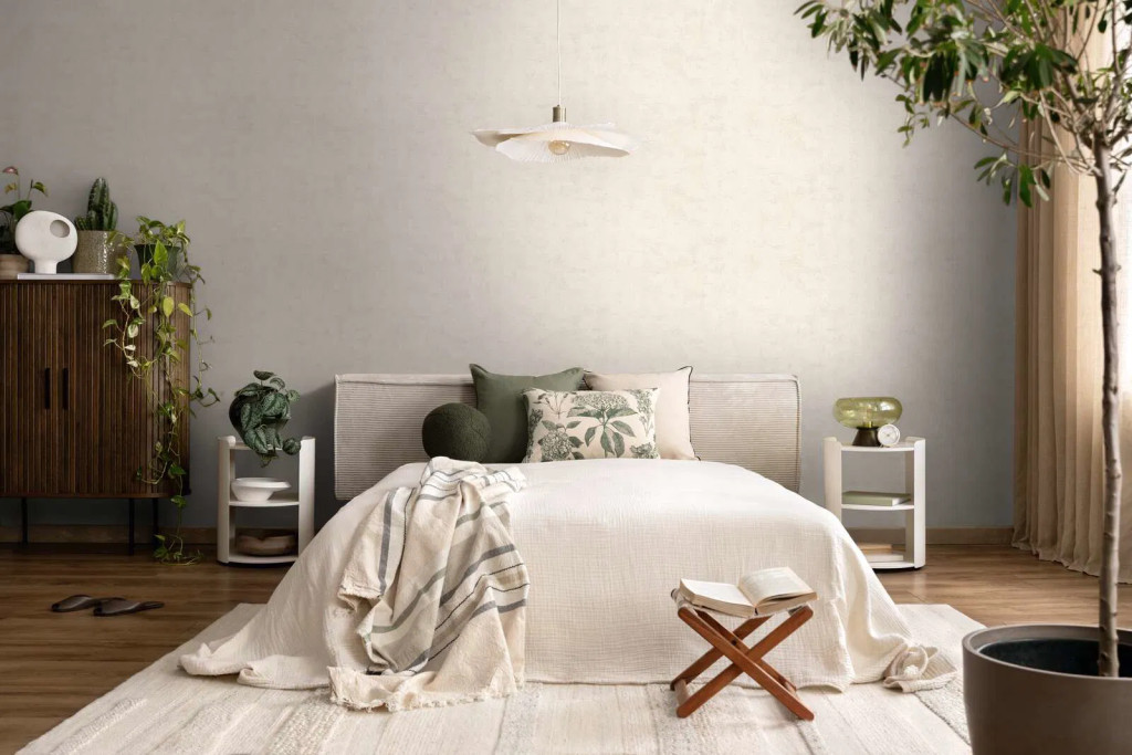 fényekkel játszik, ahogy a napfény vándorol a falon. Ez a semleges alapszín