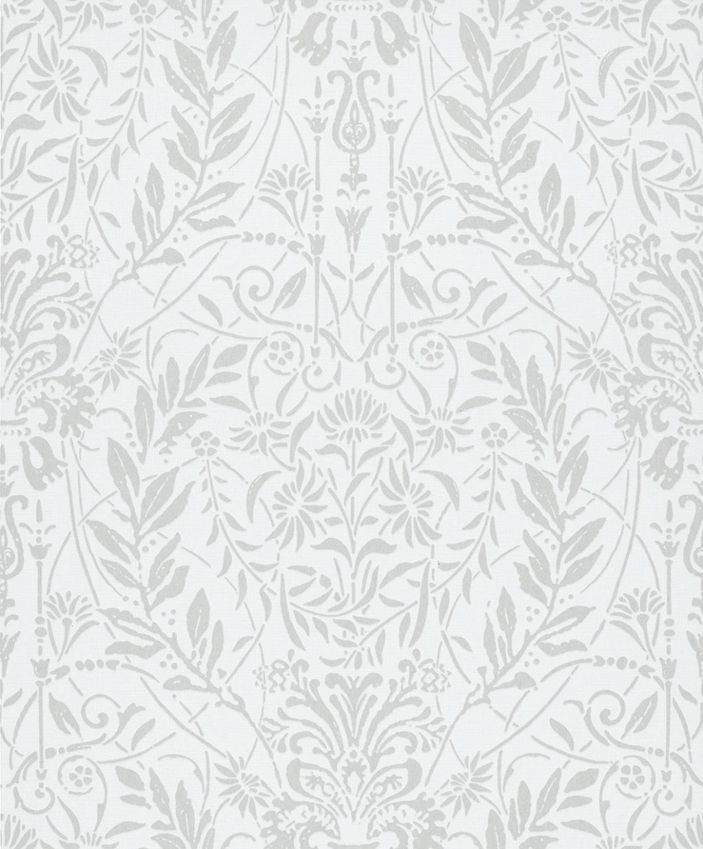 alig sötétebb szürke indák, tulipánok és szimmetrikus virágkoronák lebegnek.
