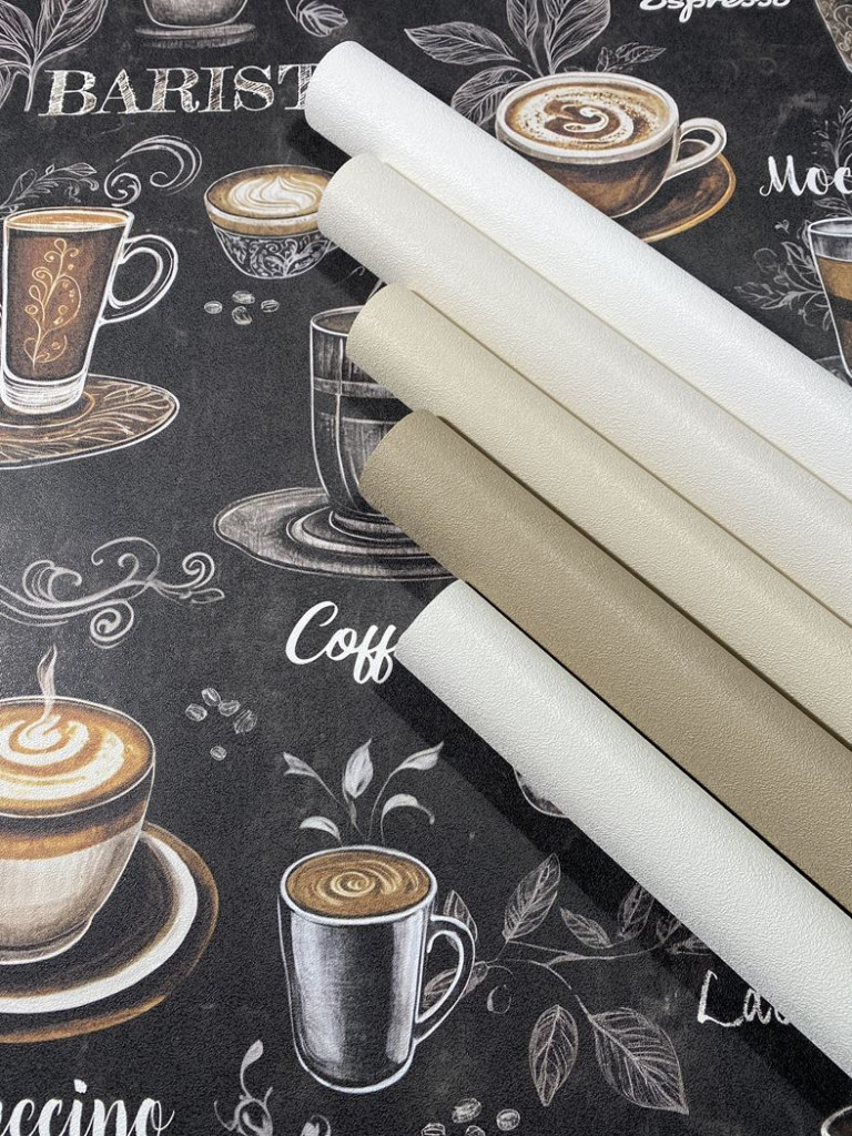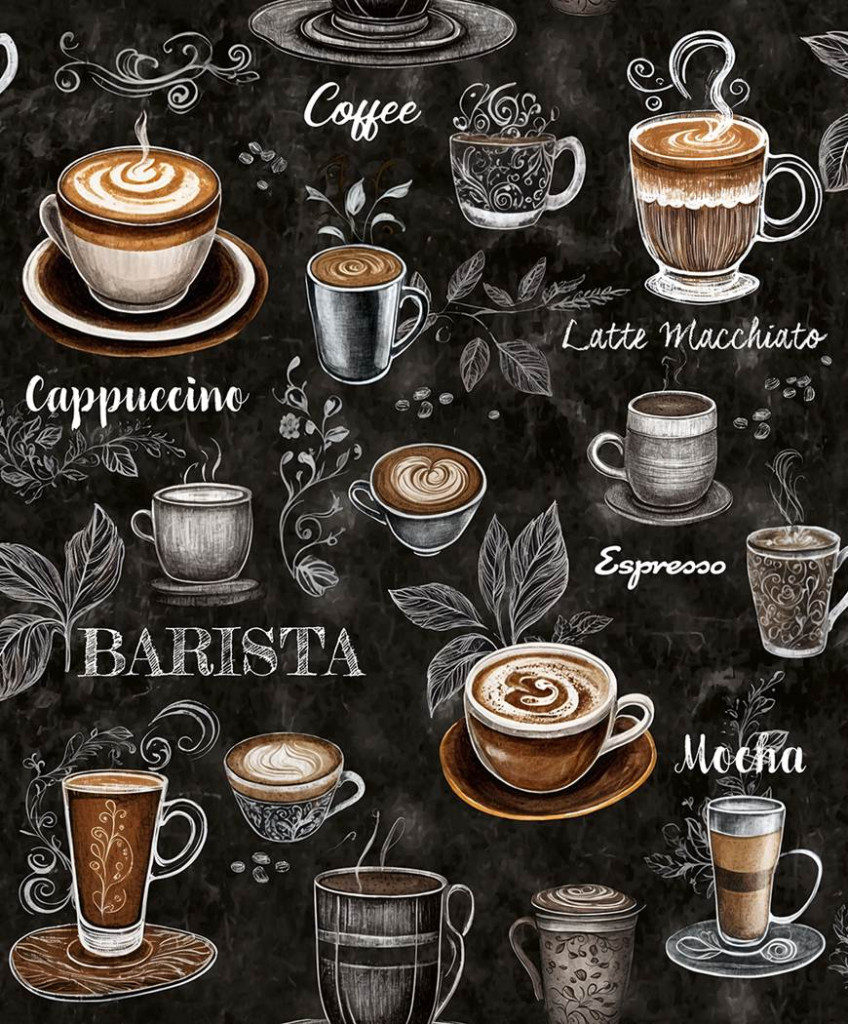 Kávészünet! Micsoda választék akár egy olasz kávézóban fekete barna szürke és fehér tónus tapéta