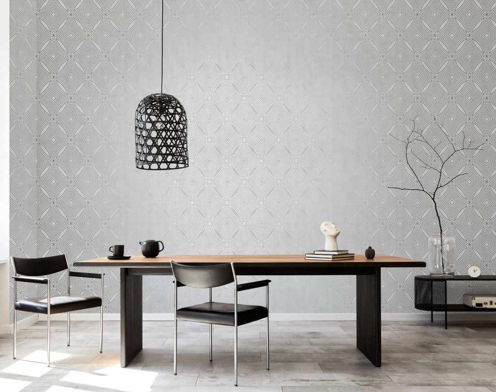 Színvilág : elegáns világosszürke alap és fémes ezüst tónusú mintavezetés