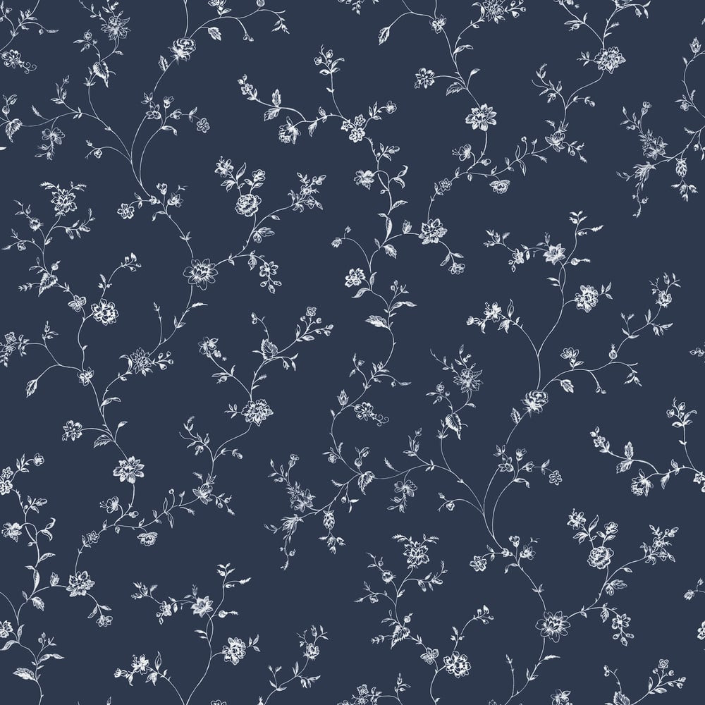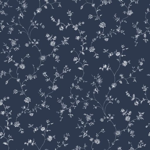 porcelán teáskészlet mintái keltek volna életre. A navy blue háttér és a hófehér botanikai rajzok