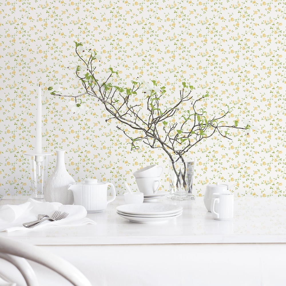 Tipp : A világos alapot vidáman futó aranyló sárga rózsaindák díszítik, melyek friss zöld leveleikkel