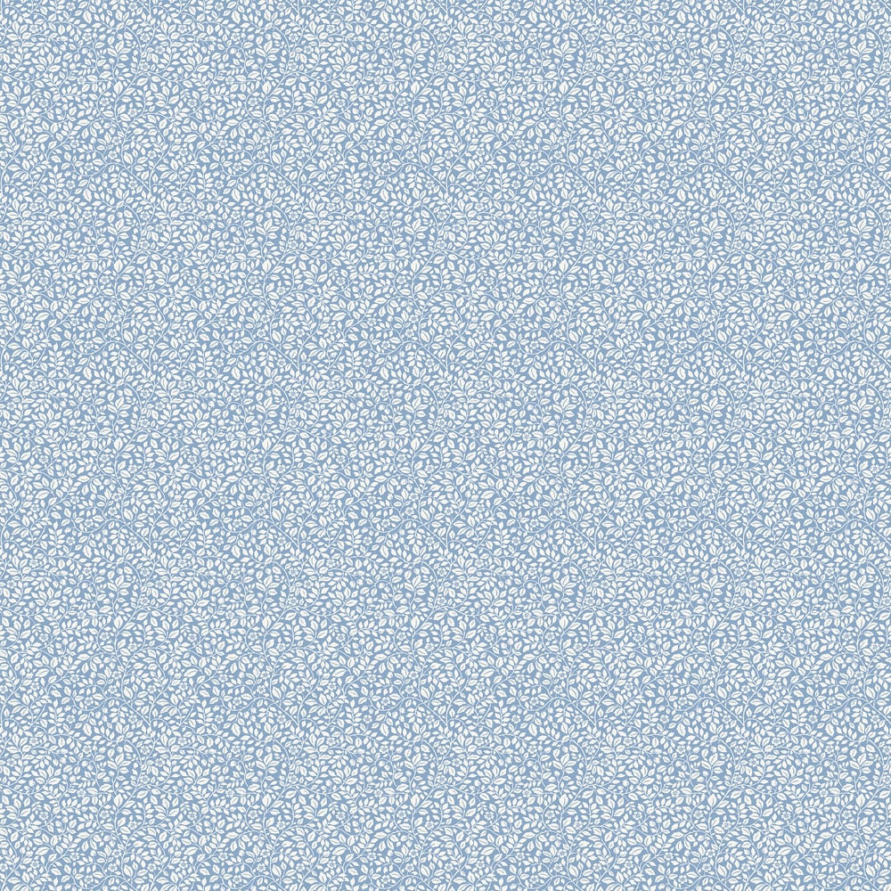 A lágy kék alapon fehér ornamentális levelek finoman keverednek, akár egy
