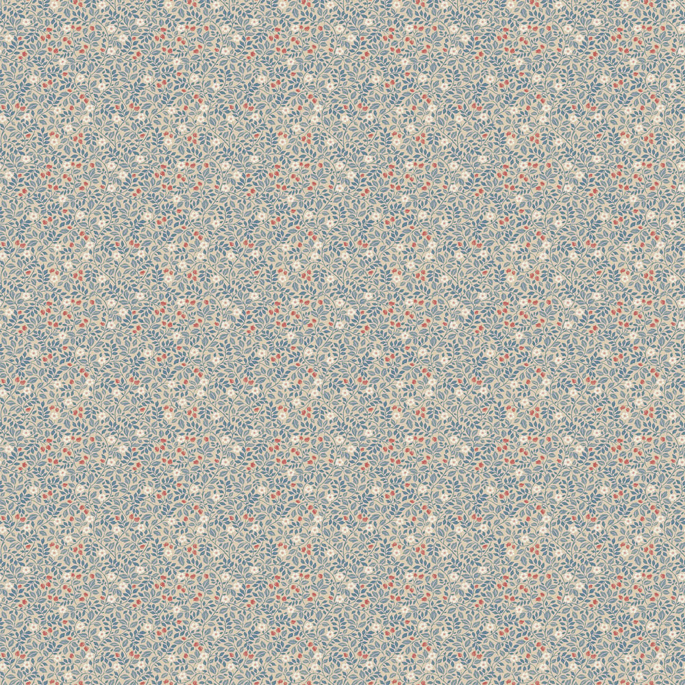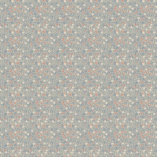 Krém/bézs alapon gazdag kék levelek és narancssárga apró virágok alkotnak