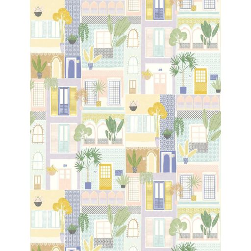 Mintázat : Szines városi házrengeteg zöld növényekkel a homlokzat felől