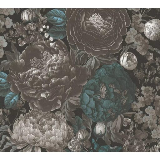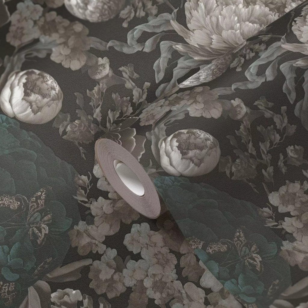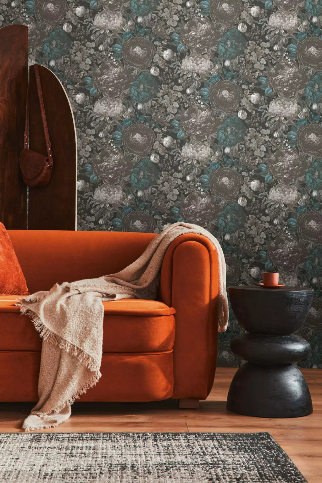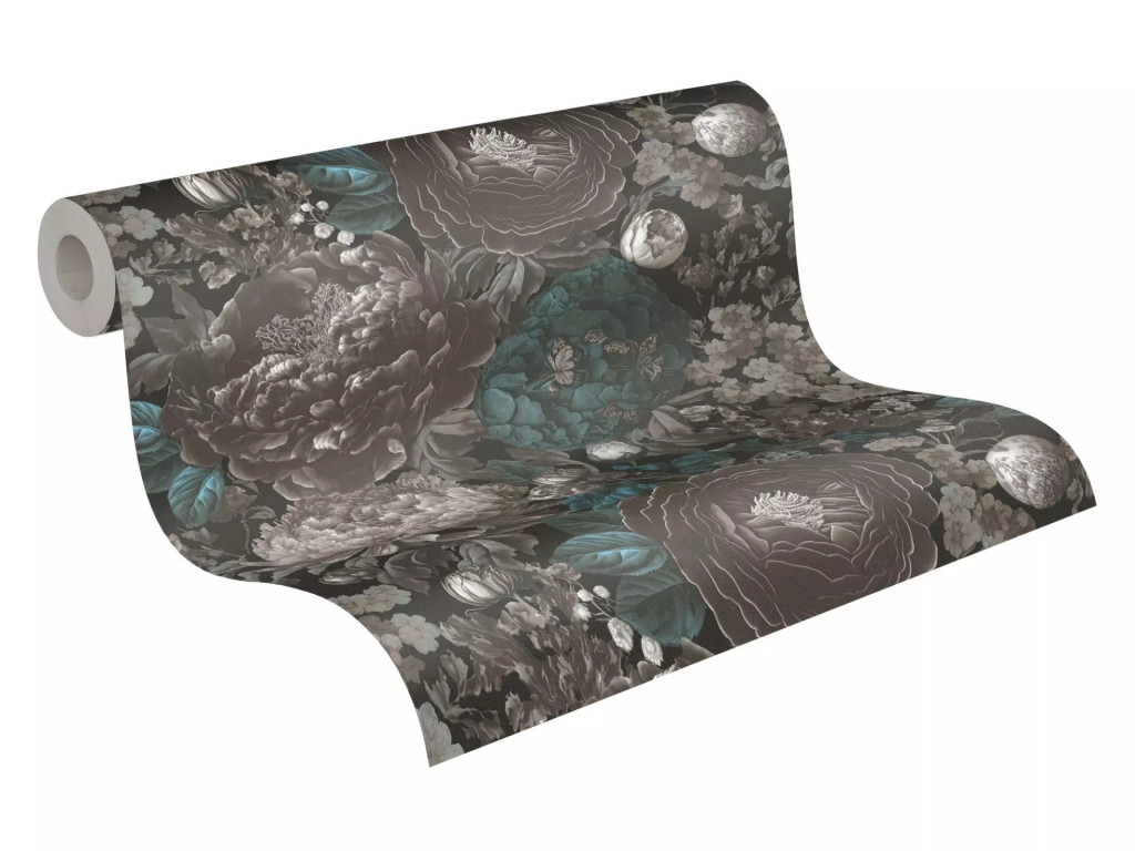 Tipp : A tapéta egy drámai sötét alapon megjelenő, nagyméretű virágmintás design